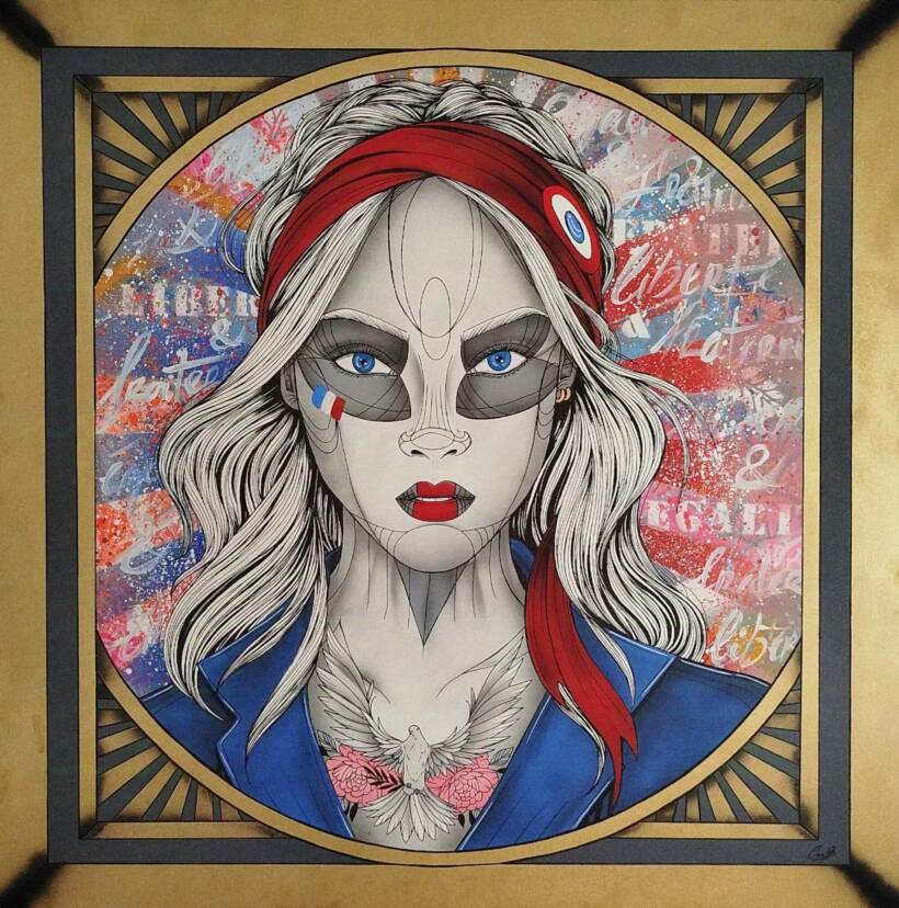 À Paris elle est représentée par Galry et commence à marquer les murs de la ville de ses créations. La graffeuse trouve son inspiration tant dans un film, ceux de Tim Burton par exemple dont elle affectionne particulièrement l’univers mais aussi au détour d’une photo, en croisant dans la rue des personnes, ou en écoutant une conversation … Son œuvre est gaie, colorée et nous fait voyager !