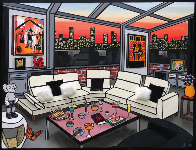 Alione is a contemporary French painter born in 1974. He reinvents the genre of Interior Portraiture with boundless creativity. Inspired by artists such as Basquiat, Van Gogh, and Gauguin, Alione develops a unique style, blending raw art, street art, and the poetry of comics.