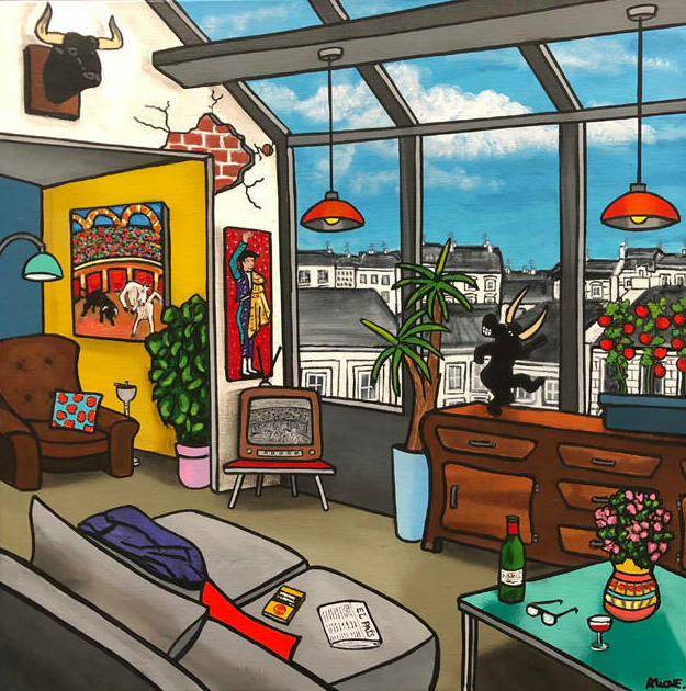 Alione doesn’t limit himself to a single artistic movement. His work reflects a palette of influences ranging from Magritte to Picasso, through the pop art of Roy Lichtenstein. His constant concern for color harmony is the signature of his style. Each of Alione’s paintings is a visual experience, evoking a whirlwind of life and emotion through interior scenes populated with symbols. The artist invites the viewer to decipher these detail-rich spaces, discovering hidden stories within scenarios of everyday life intertwined with the history of art.