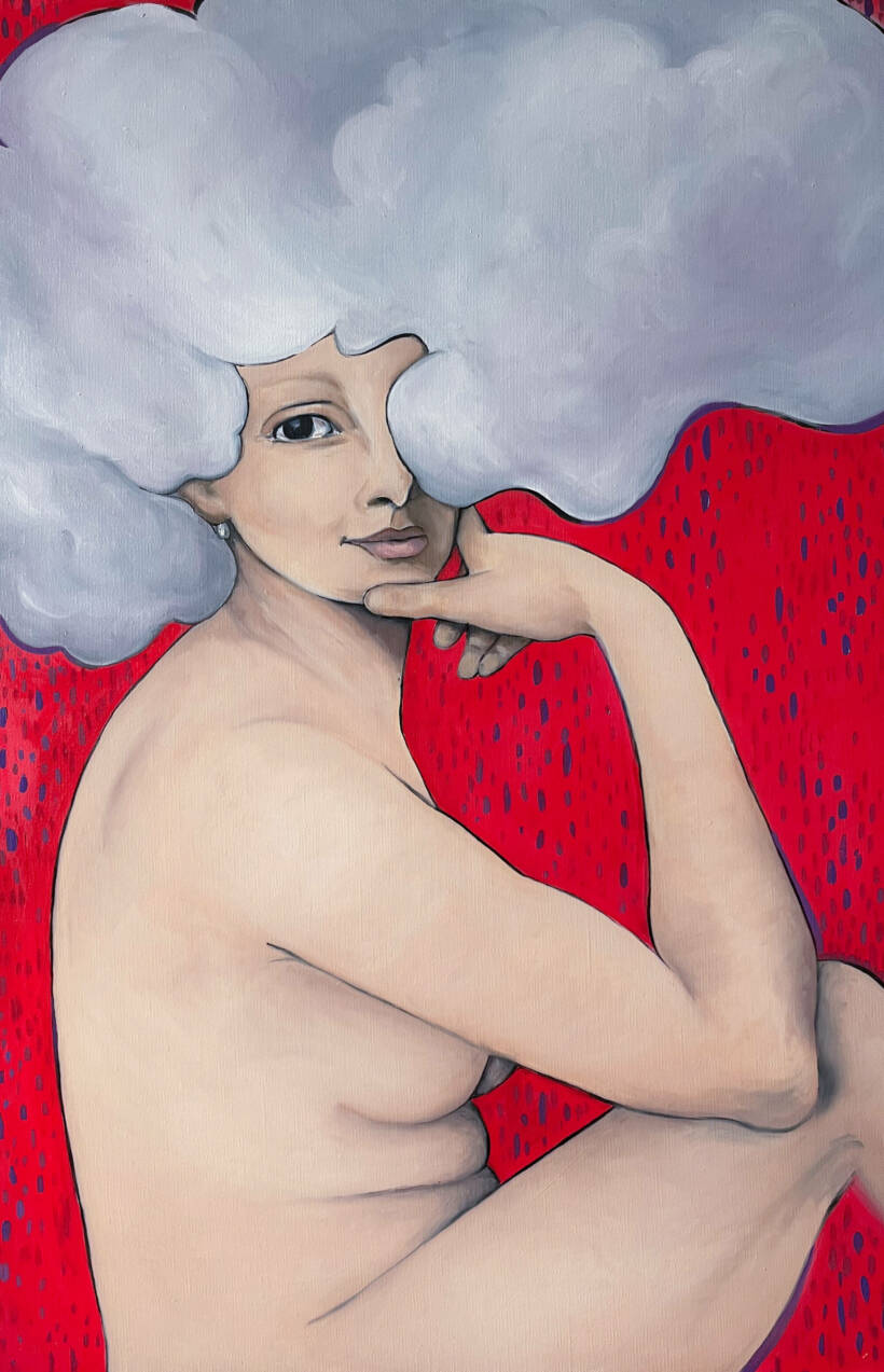 Her Cloud-Women, dreamlike figures wrapped in swirling clouds, invite both reverie and reflection. They blur the boundaries between body and landscape, between the