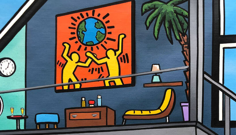 On the upper floor, a large painting inspired by Keith Haring, with its stylized yellow figures dancing around a globe, reinforces the idea of gathering and unity among peoples