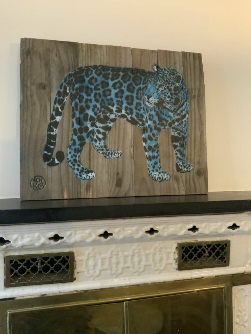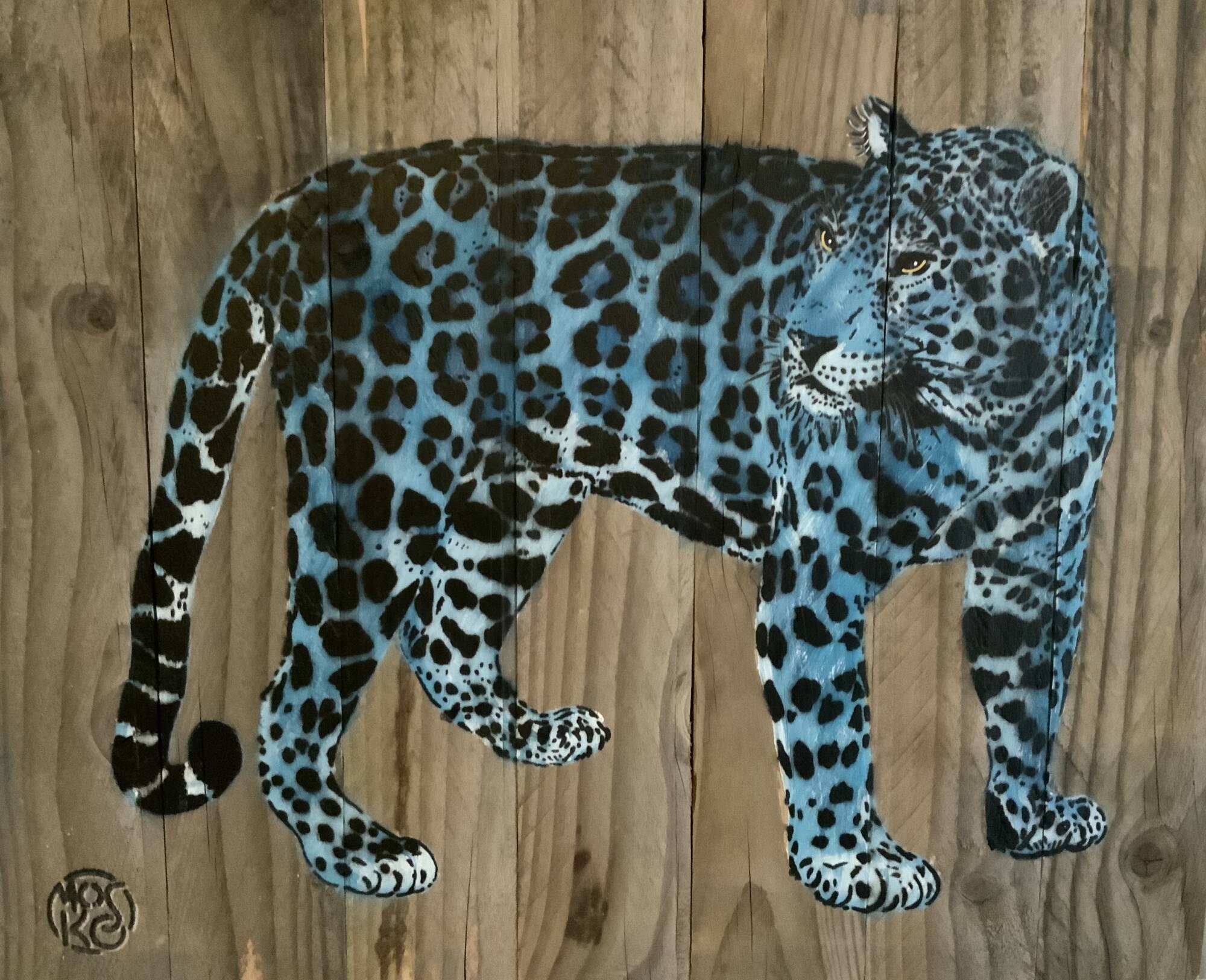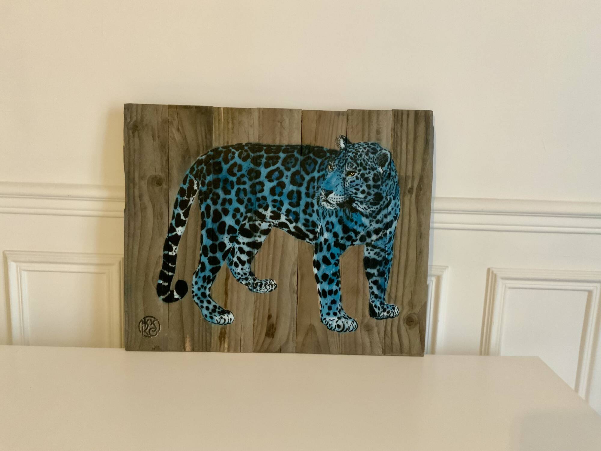 Contact usOn a raw wooden surface, the feline emerges like an unreal apparition. Its spotted coat, tinged with a deep blue, breaks away from natural codes and invites a more symbolic interpretation: that of an animal suspended between the wild world and a dreamlike realm.