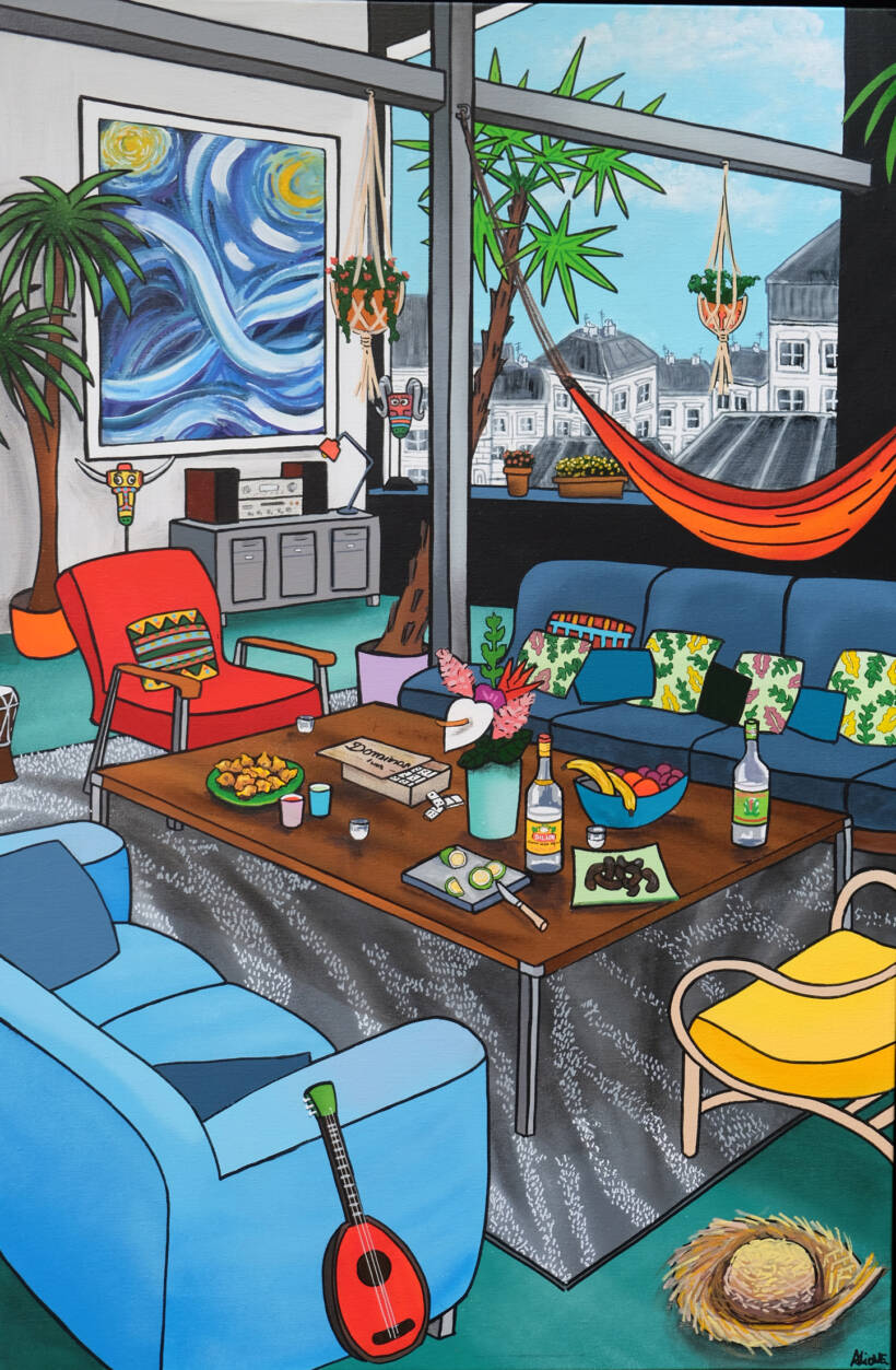 Contact usIn Souvenir d’une nuit étoilée, Alione depicts a Parisian interior still marked by the vibrant traces of an island journey. Back in the capital, the painter seems to have brought home the colors, warmth, and softness of tropical nights, and laid them gently into this luminous living room.