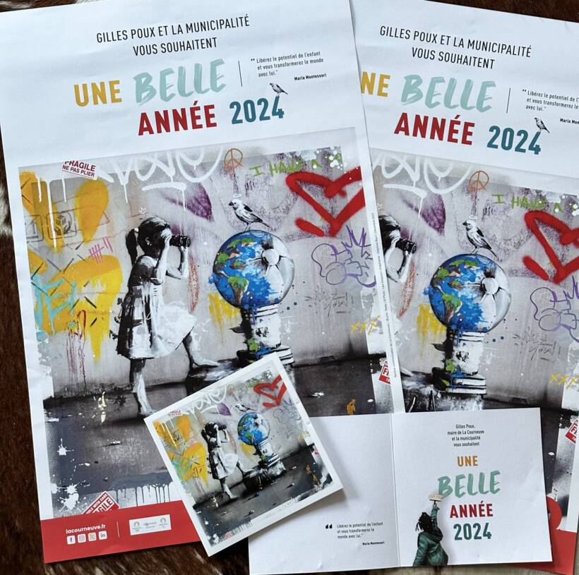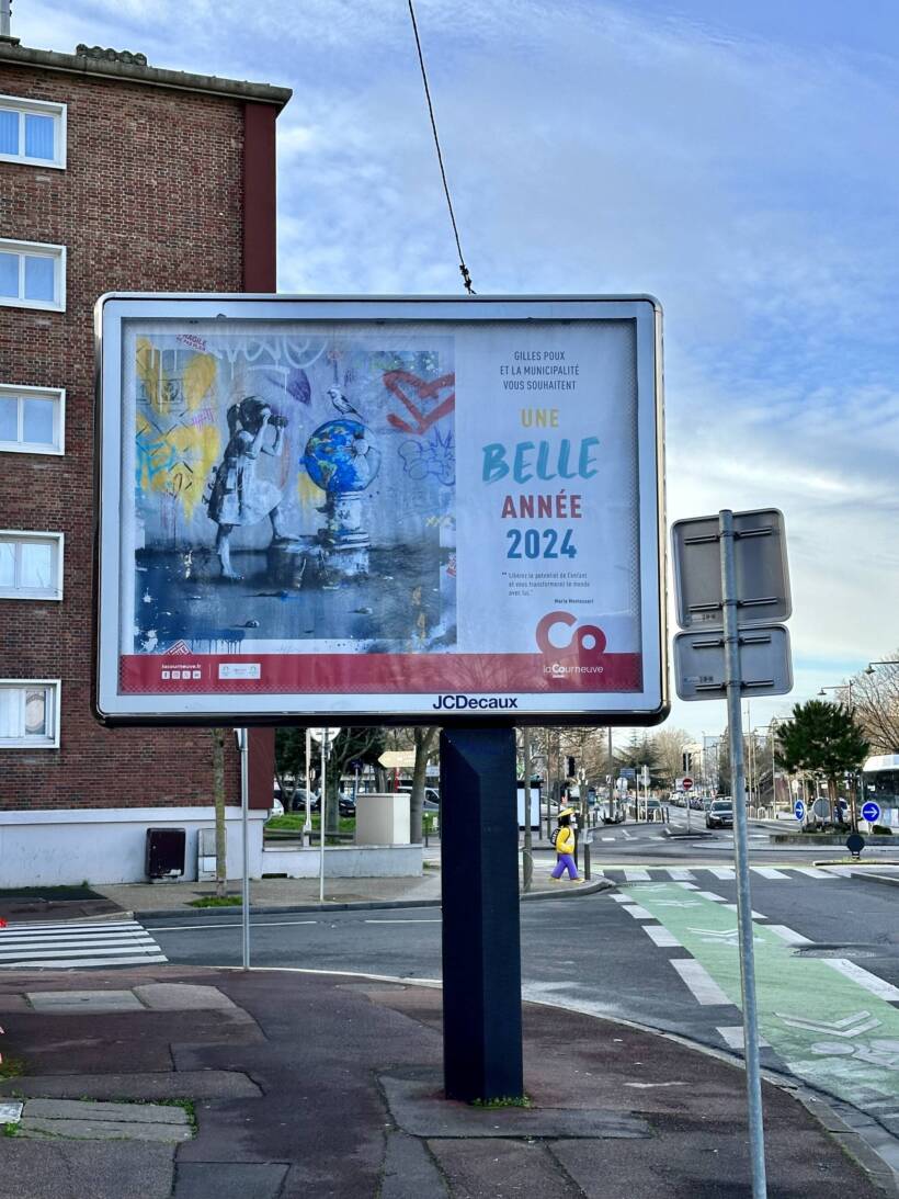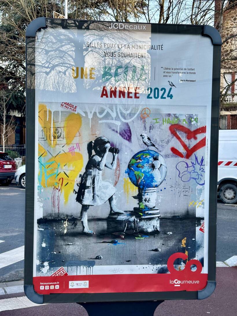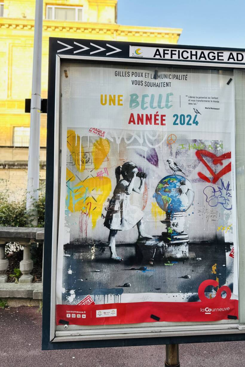 The city of La Courneuve has called upon Galry to accompany it in its 2024 New Year wishes campaign. The Mayor’s choice fell on a work by SEATY titled “Imagine.” This piece depicts a little girl looking at a world map through binoculars; she is surrounded by symbols and messages of freedom and peace. Through this sublime, colorful, and positive artwork, the city of La Courneuve conveys a beautiful message of hope to all its residents for 2024.
