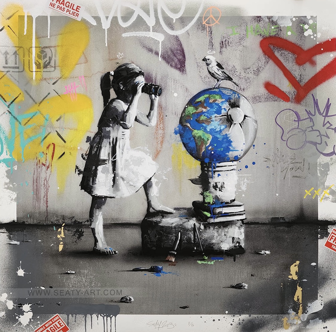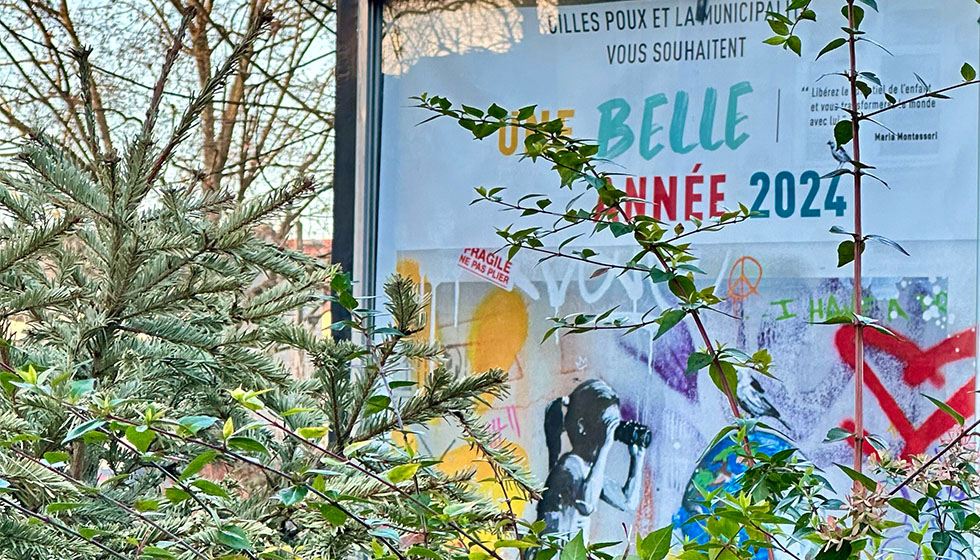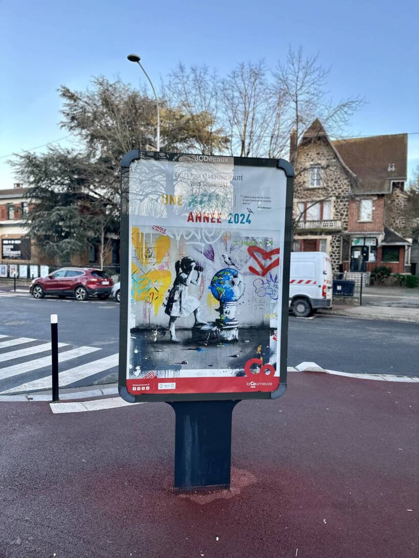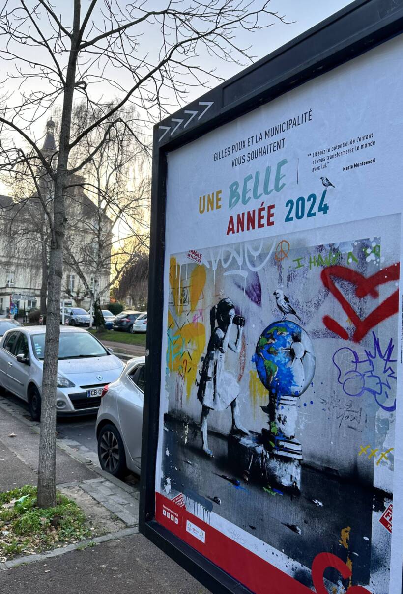 The city of La Courneuve has called upon Galry to accompany it in its 2024 New Year wishes campaign. The Mayor’s choice fell on a work by SEATY titled “Imagine.” This piece depicts a little girl looking at a world map through binoculars; she is surrounded by symbols and messages of freedom and peace. Through this sublime, colorful, and positive artwork, the city of La Courneuve conveys a beautiful message of hope to all its residents for 2024.