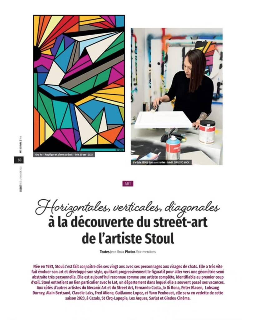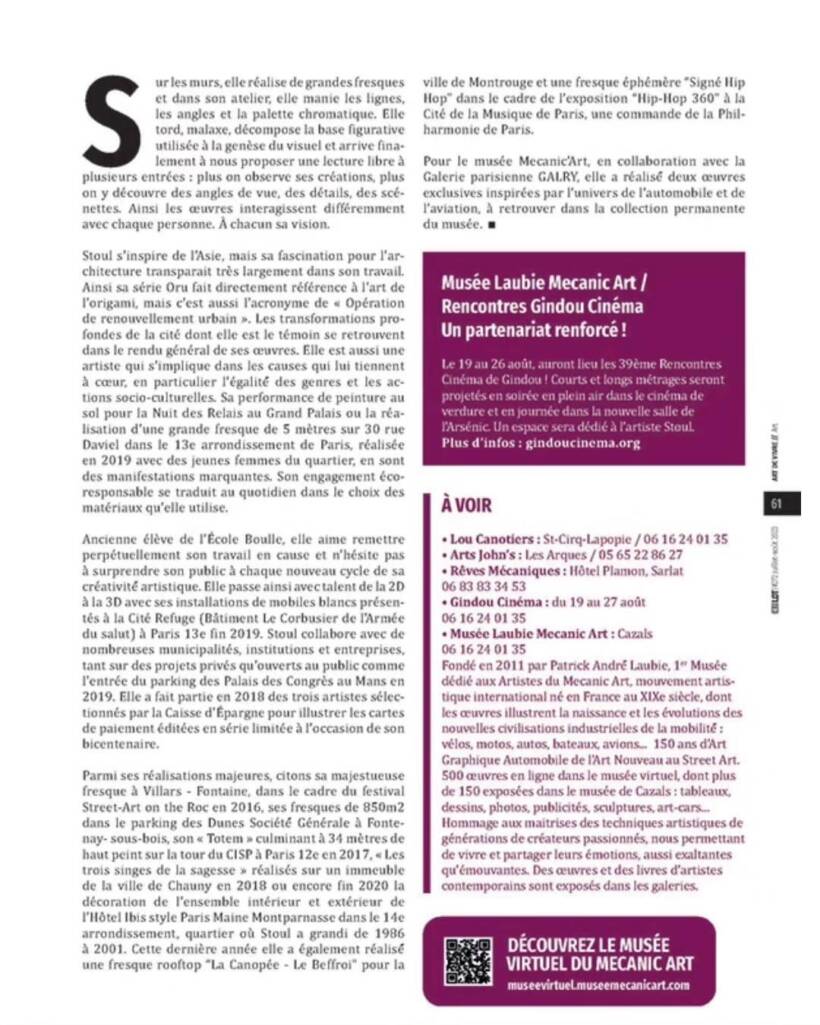 Une nouvelle œuvre de l’artiste Stoul fait son entrée ce samedi 1er Juillet au Musée Mecanic Art dans le Lot en France. Il s’agit du premier musée dédié au street art et aux artistes du Mecanic Art, mouvement artistique international, né en France au XIXe siècle et dont les œuvres illustrent la naissance et les évolutions de la nouvelle civilisation industrielle et des transports.