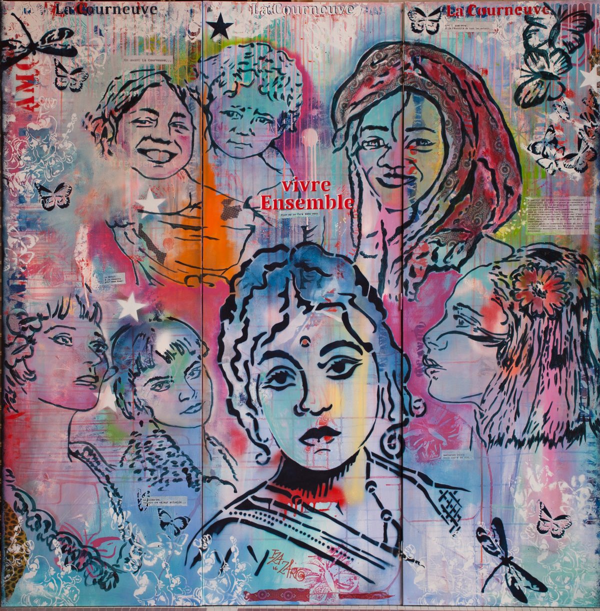 GALRY et son artiste IZa Zaro ont été mandatés pour réaliser une toile de 150 x 150 cm représentant l’humain et la diversité de la ville, au cœur de la préoccupation du maire. L’artiste fidèle a son univers a représenté des femmes, dans toutes leurs différences… mais unies.
