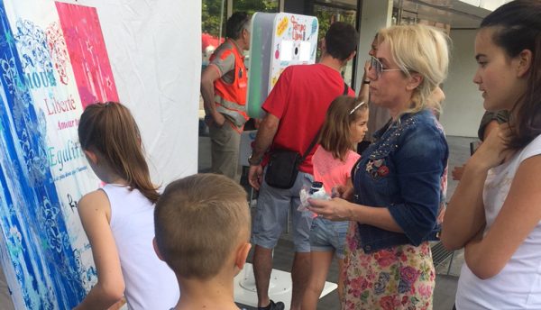 L’ artiste a permis à quelques personnes et notamment des enfants de participer à la création de sa toile. En 3 heures de performances, ce sont quelques centaines de personnes qui ont regardé l’artiste travaillé et ont assisté en direct à la création d’une œuvre : de la toile blanche au cœur bleu/blanc/rouge et aux mots évocateurs si chers à l’artiste : amour, liberté…