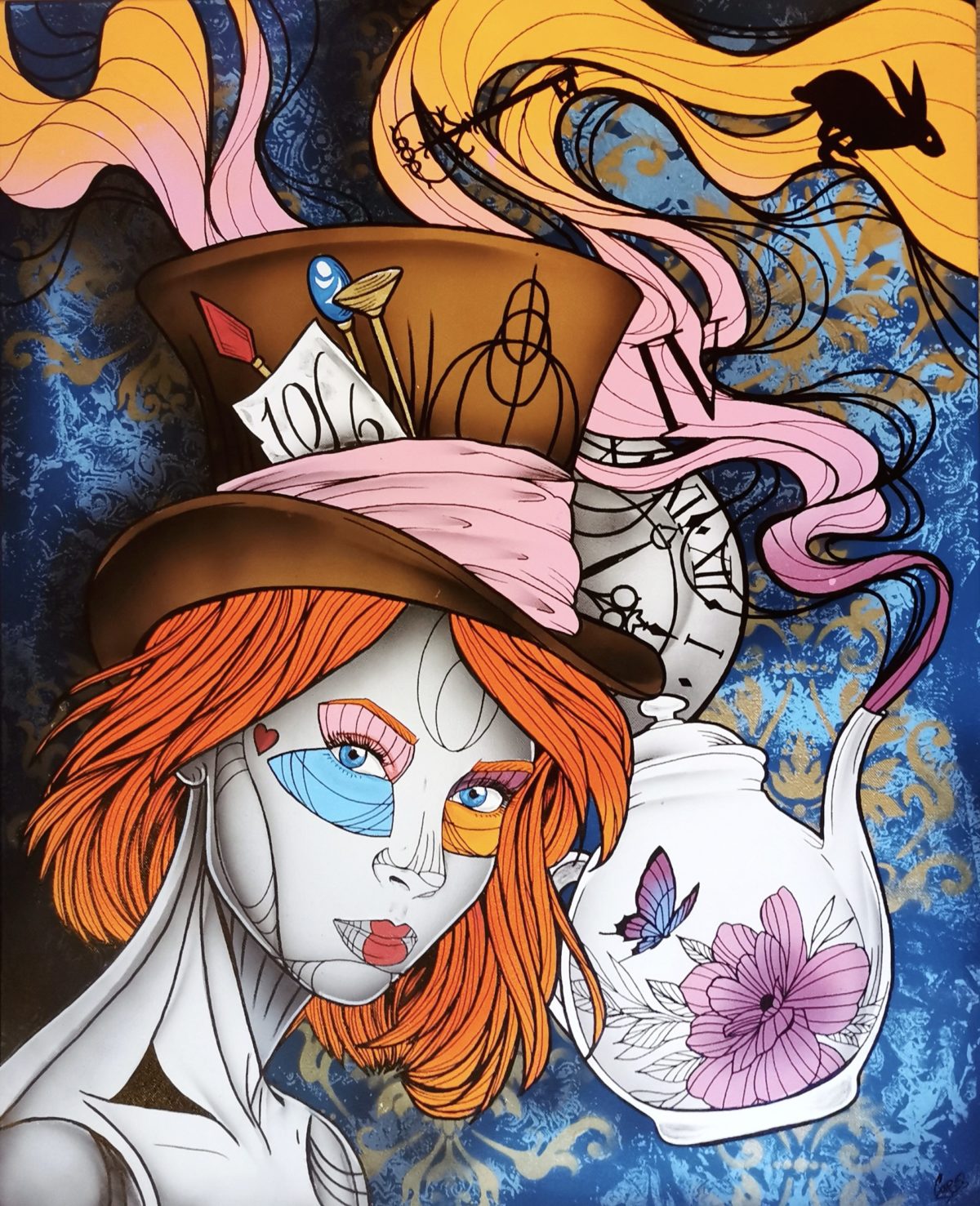 Ses toiles peuvent évoquer Alice au pays des merveilles, Mary Poppins ou encore des personnages issus de l’univers de Tim Burton… le fantastique et la fantaisie ne sont jamais très loin avec cette artiste singulière qui nous emmène en voyage avec elle !