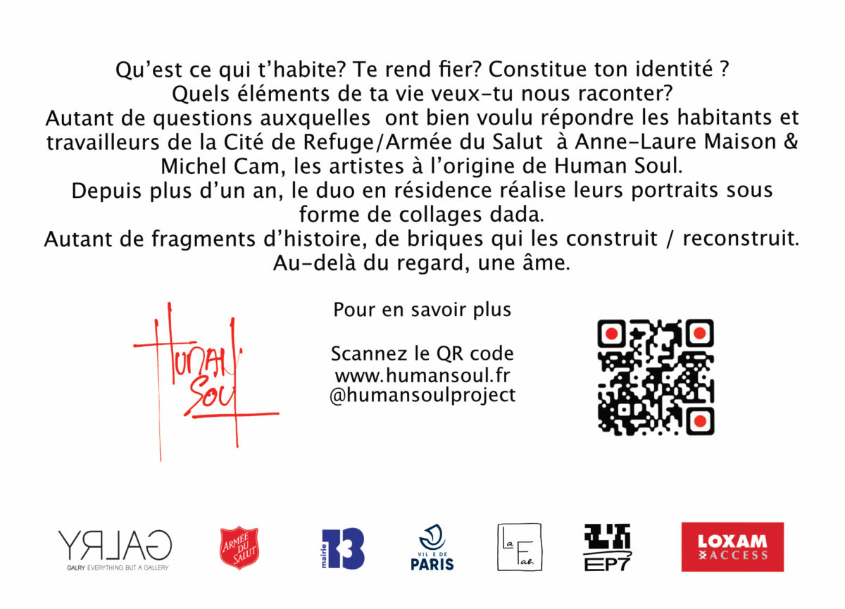 Human Soul poursuit son action et emmène cette fois les résidents de la Cité de Refuge dans une campagne de collages et de street art dans les rues de Paris. Pendant plus d’un an, les artistes ont collecté la parole des habitants et on créé avec eux des portraits sous formes de collage à la manière du mouvement artistique Dada.