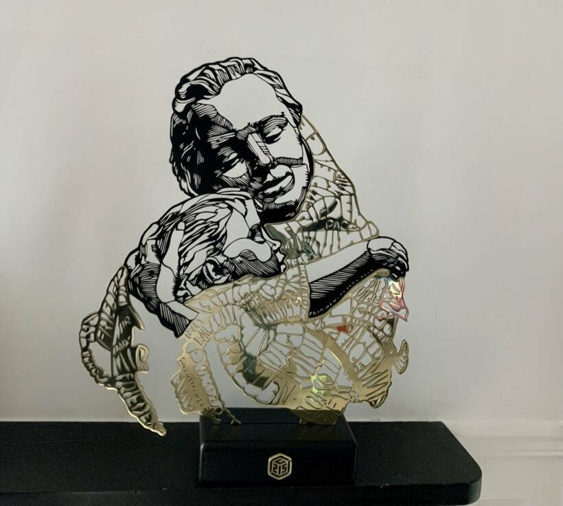 Amour filial – Peinture sur métal, socle bois et résine – 51 x 42 x 10 cm