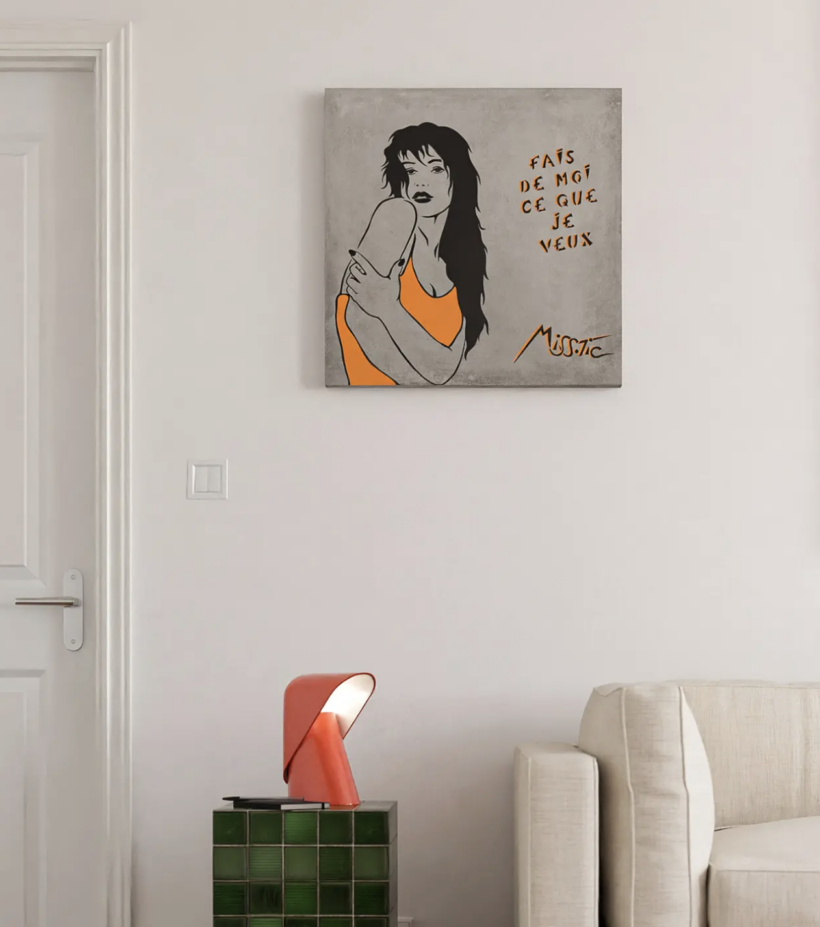 Elle trouve avec ce texte percutant toute son énergie de poétesse, sa liberté et la sensualité de ses œuvres.Le choix de la couleur orange s’est imposé après de nombreux essais, la Miss voulait une œuvre qui marque ; séductrice et espiègle.