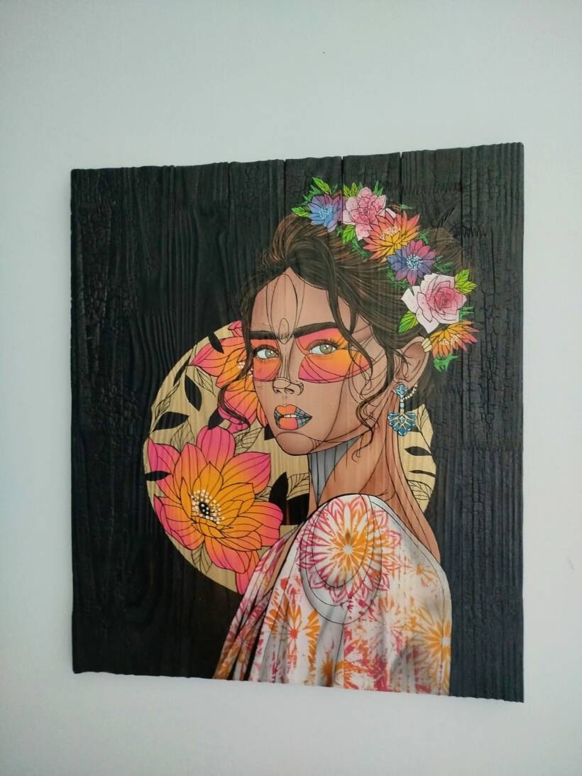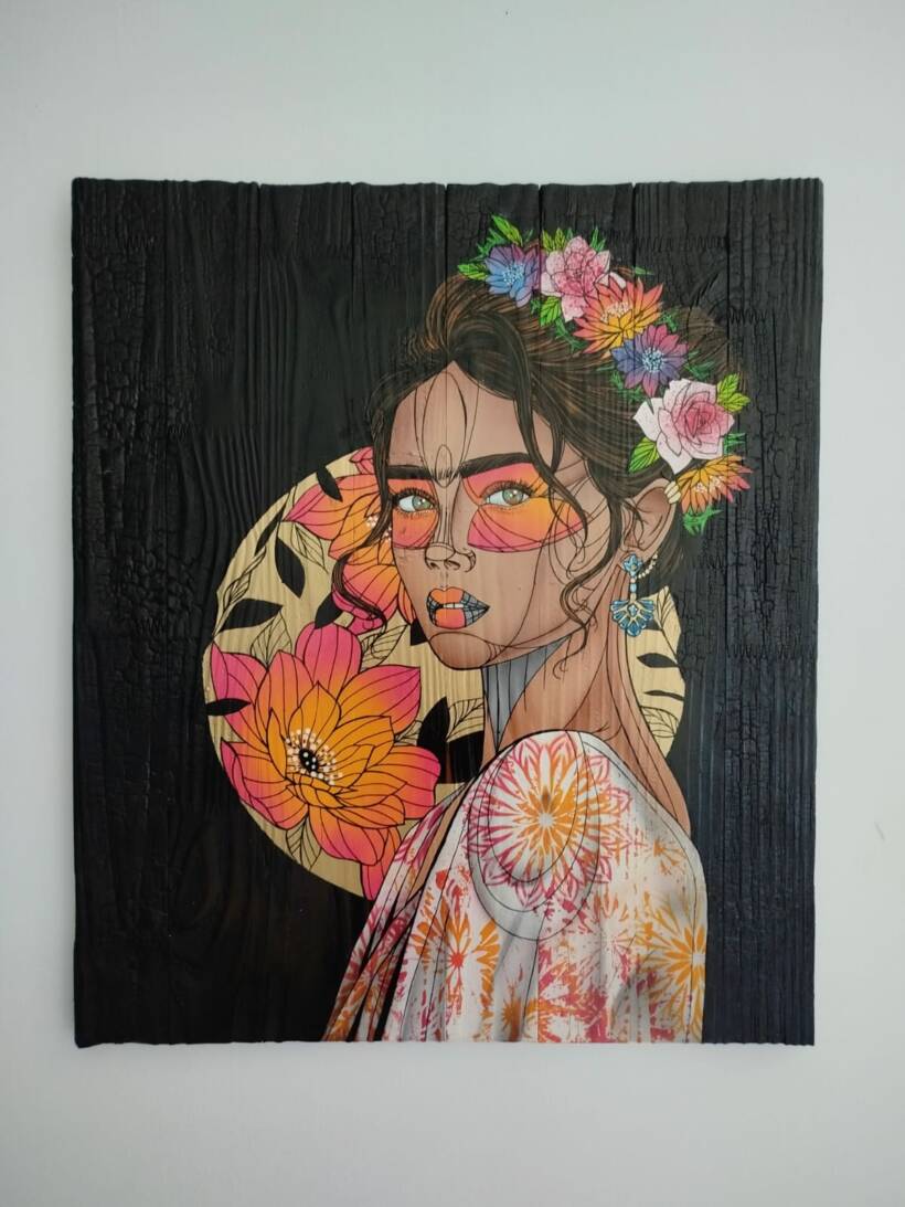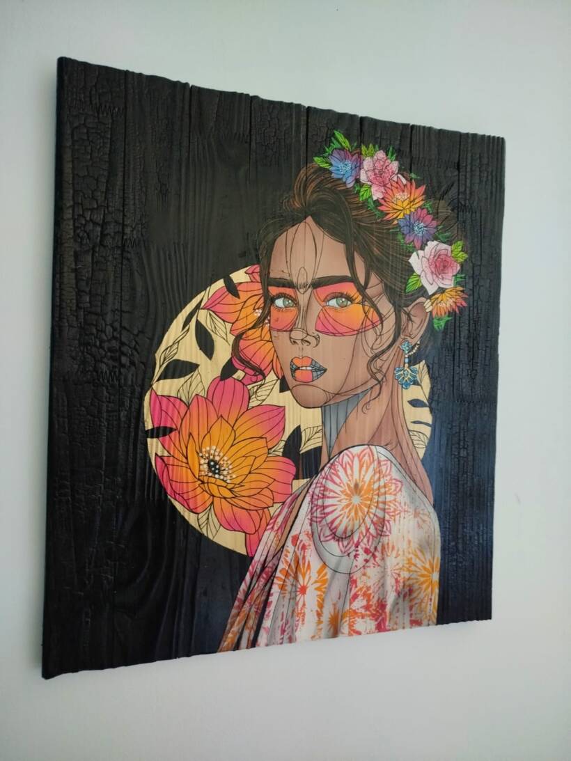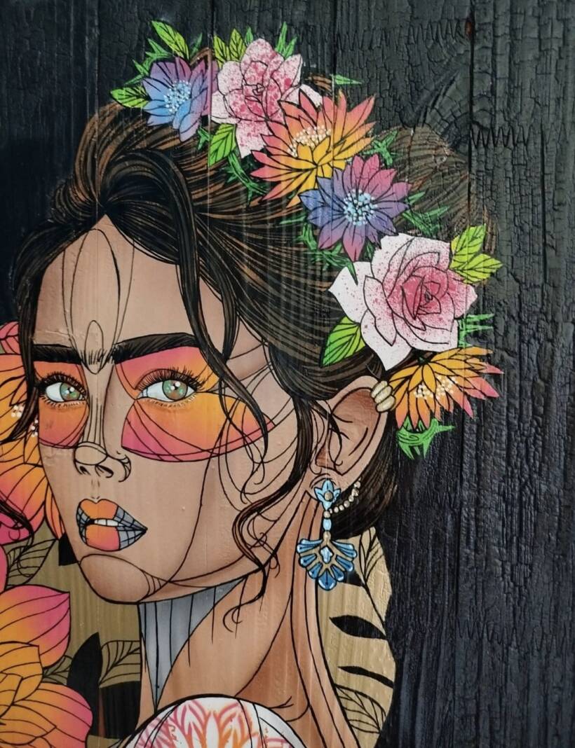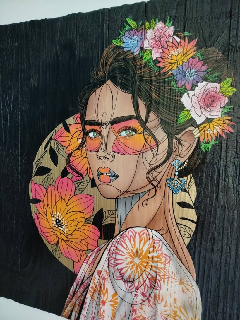 Caro Graffiti – Viva Frida – Techniques mixtes sur bois brûlé – 70 x 60 cm