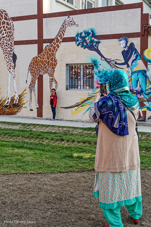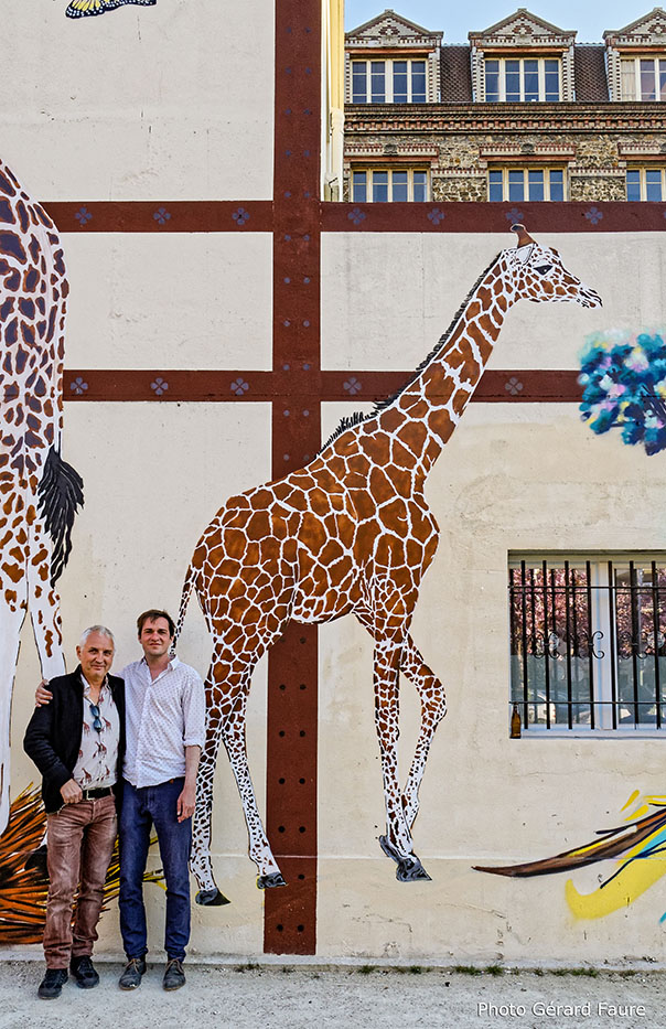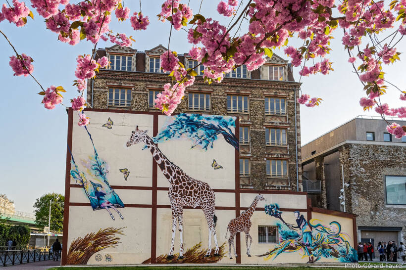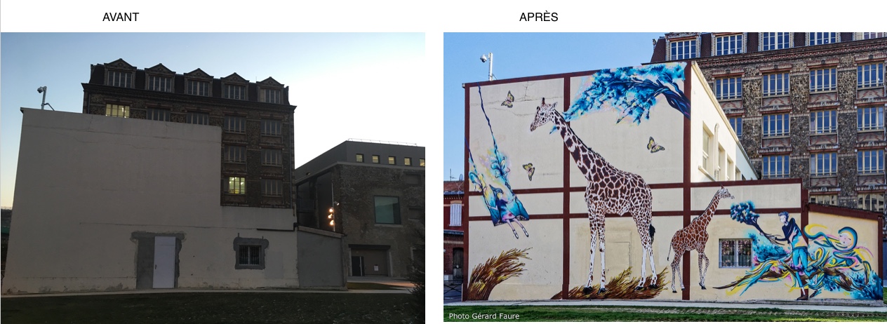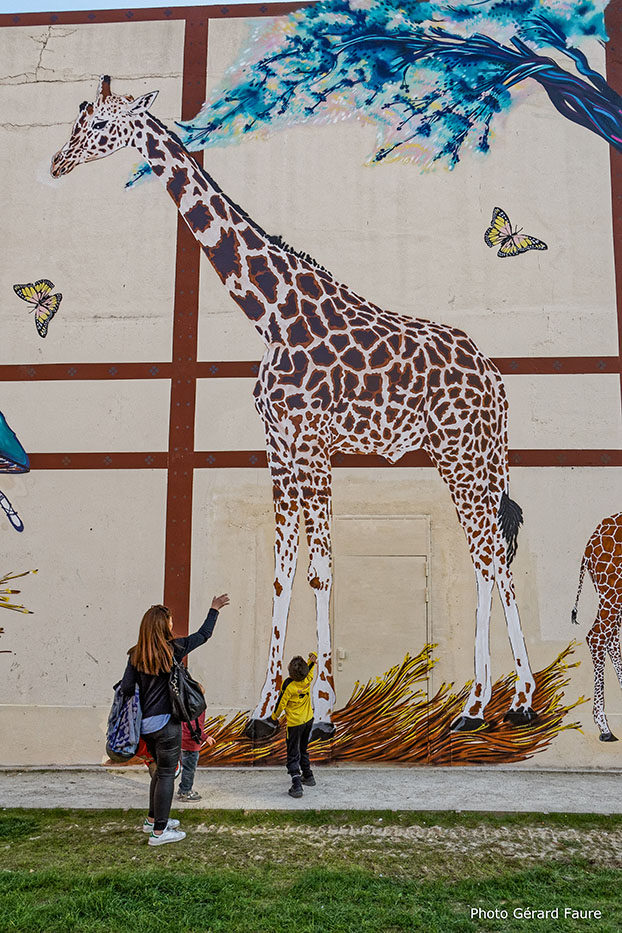 Ces 2 stars du Street Art se sont emparés d’un immense mur administratif pour l’investir de leurs univers artistiques. Cette collaboration Street-Art haute en couleur a donné lieu à une création visible de tous où la nature s’invite dans la ville et le dialogue s’instaure entre les animaux de la savane de MOSKO (dont la girafe, symbole de la paix) et les personnages poétiques et oniriques d’ANIS !